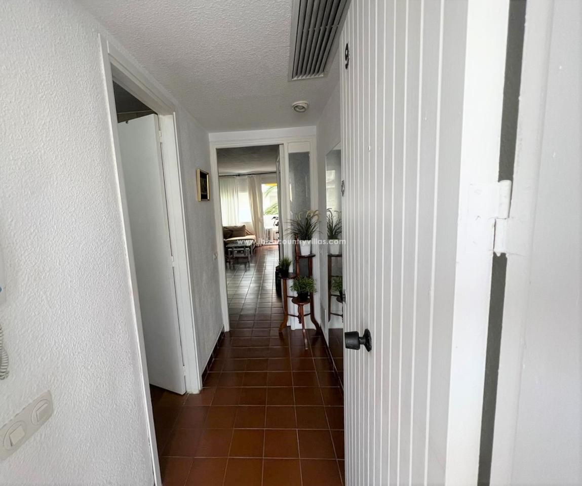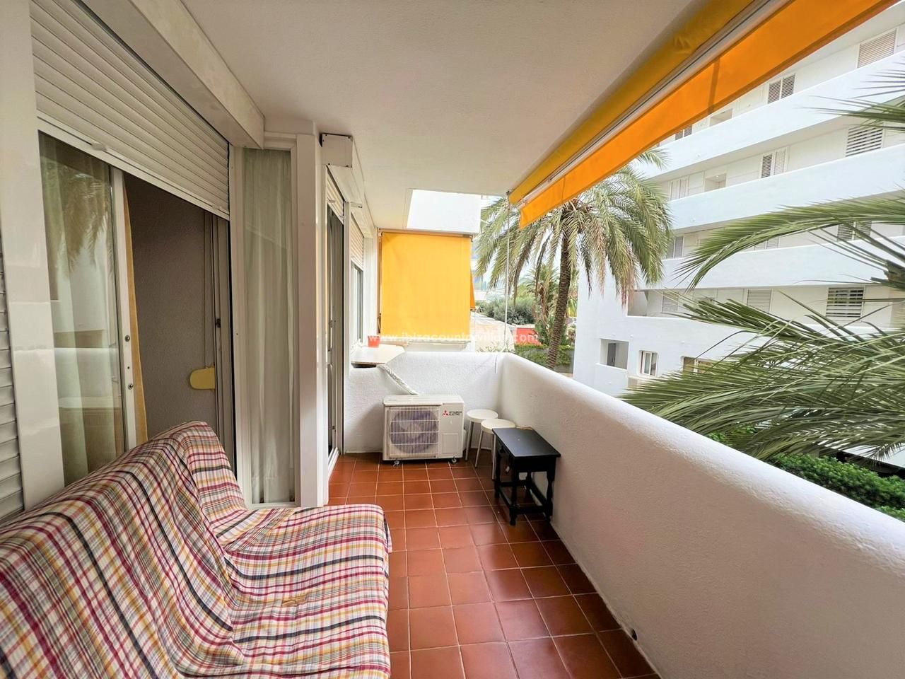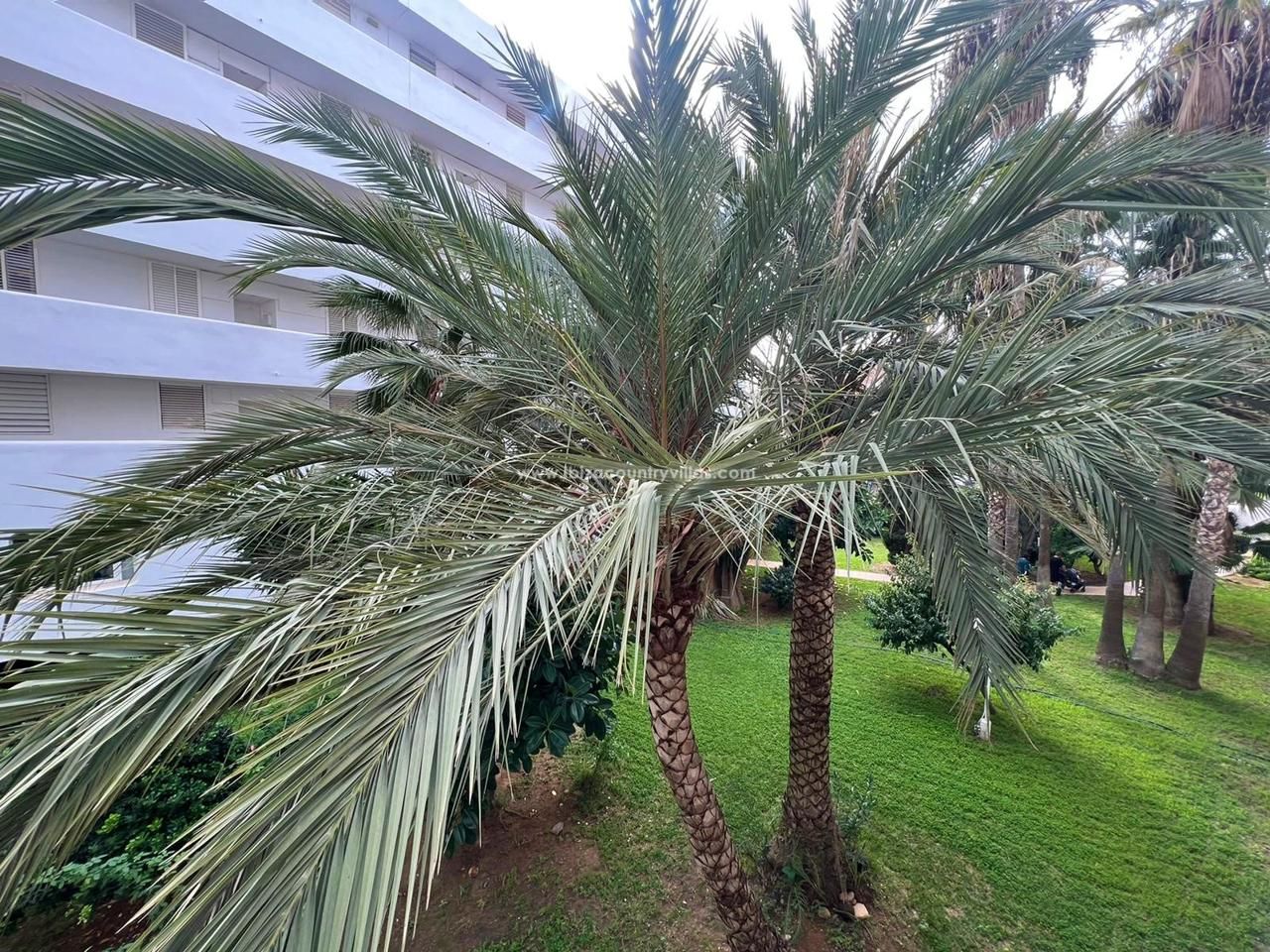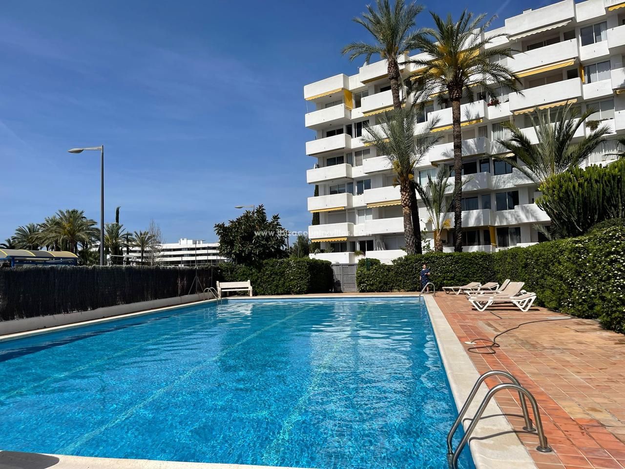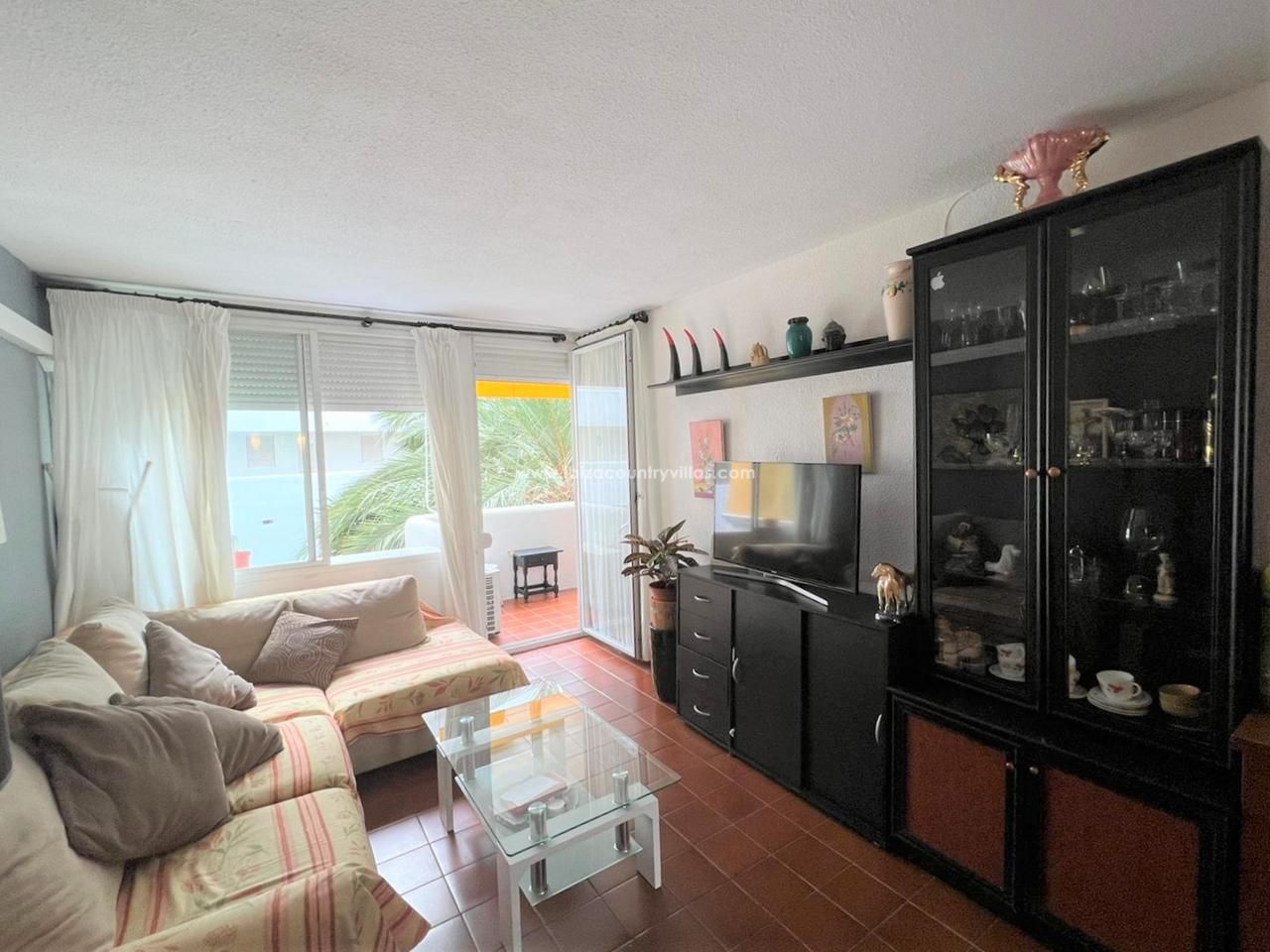 The apartment consists of a living/dining room, independent and fully equipped kitchen, two bedrooms with fitted closets that share a bathroom. The property also offers air-conditioning throughout and a balcony overlooking the communal garden area.