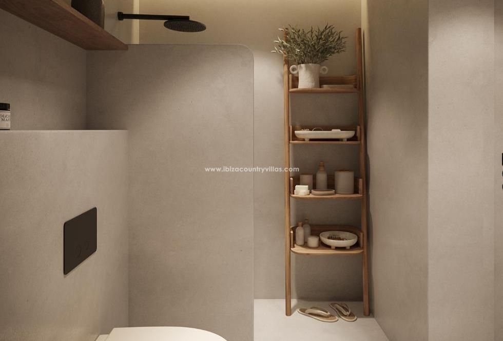 The apartment offers two serene bedrooms, each combining minimalist elegance with a cozy atmosphere. The master bedroom features a generous double bed, refined finishes, and subtle lighting, while the second bedroom provides flexibility for guests or family. The two bathrooms are finished in smooth microcement with walk-in showers, achieving a sleek, low-maintenance aesthetic.