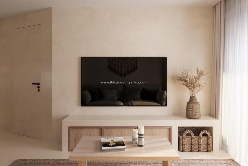 The contemporary kitchen is fitted with sleek cabinetry and a breakfast bar—ideal for both quick meals and relaxed gatherings. The living area flows seamlessly to a private terrace through floor-to-ceiling sliding doors, framing captivating views of Dalt Vila. Thoughtfully designed with lounge seating and soft greenery, the terrace offers a peaceful retreat amid the vibrant Marina setting—perfect for morning coffee or sunset cocktails.