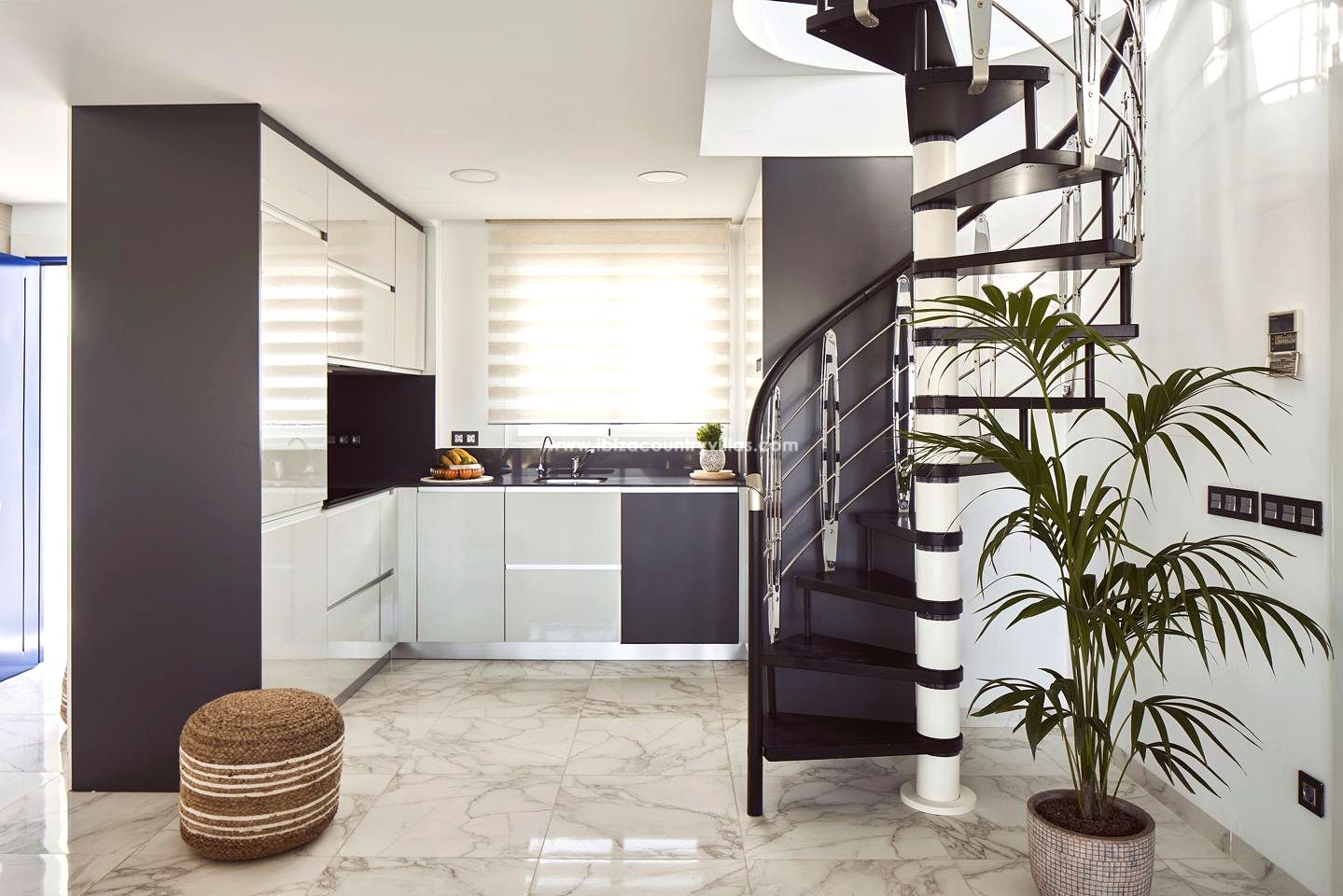 All homes share the same size and layout. They feature a spacious living-dining area, open kitchen, a semi-circular terrace of over 15m², and three bedrooms (the master en suite) with sea views. A staircase leads up to a private solarium, ideal for relaxing or taking in the panoramic scenery.