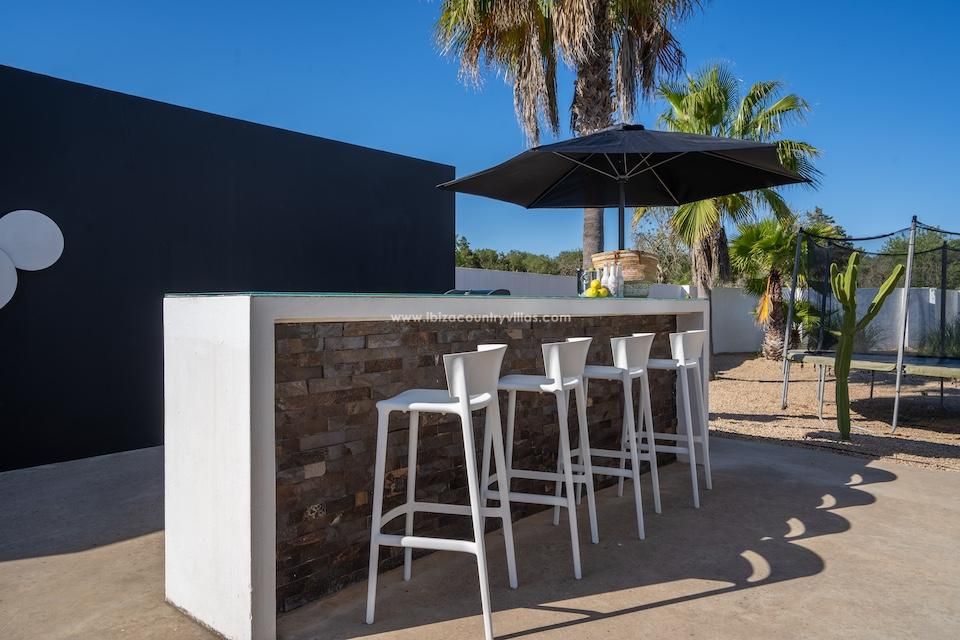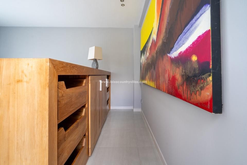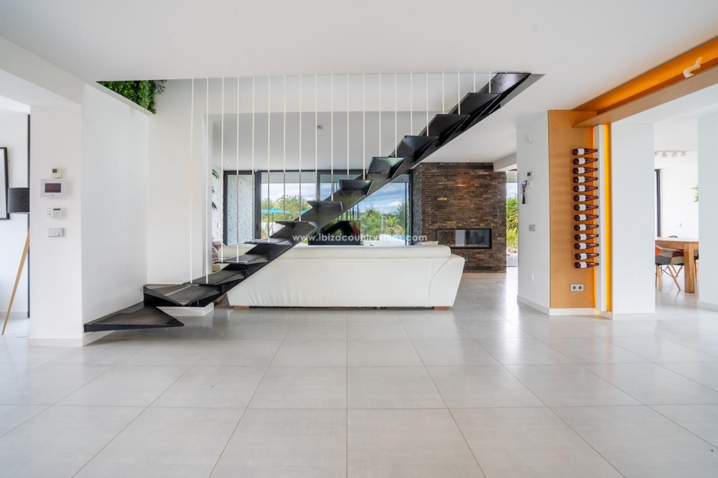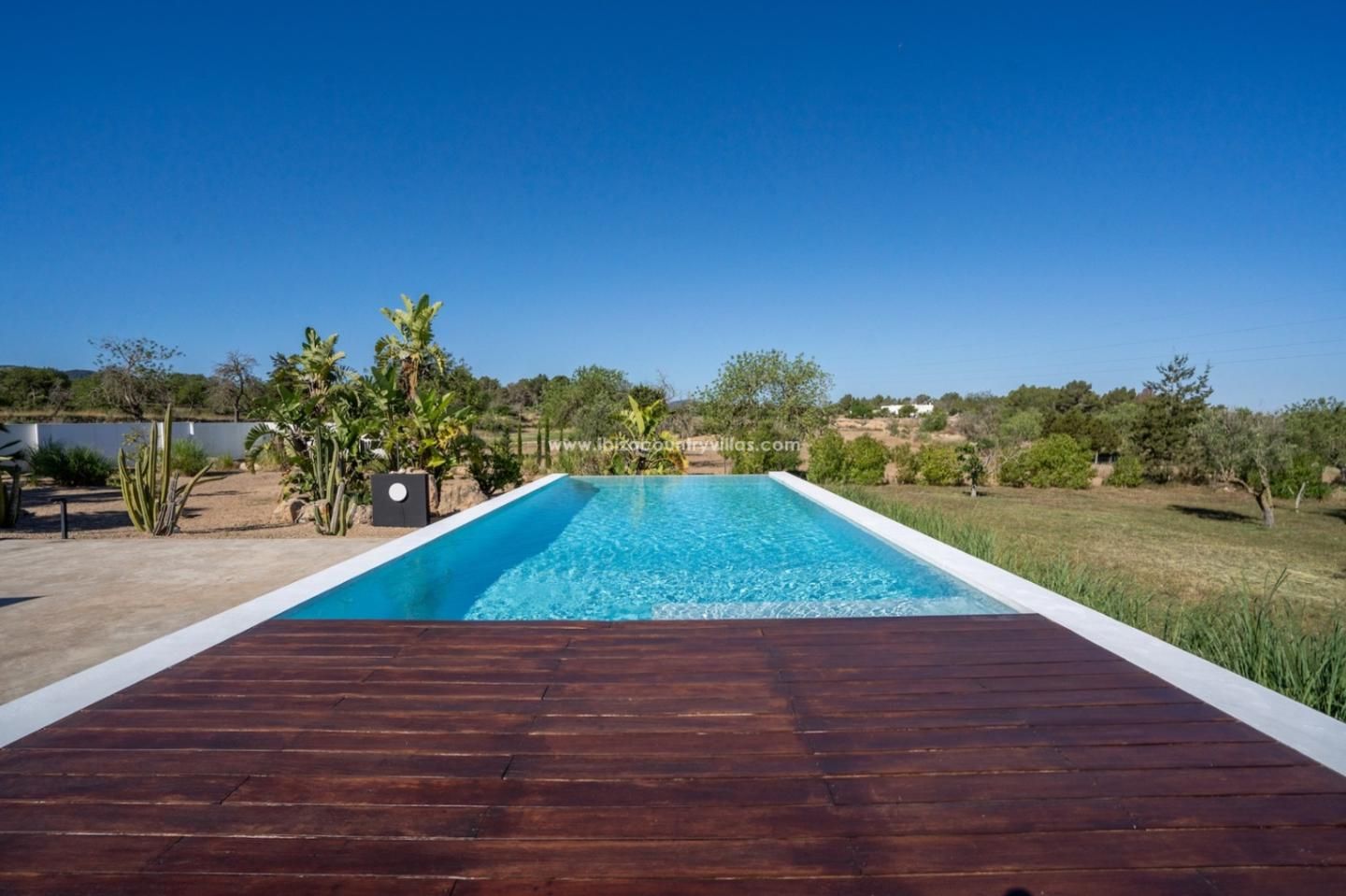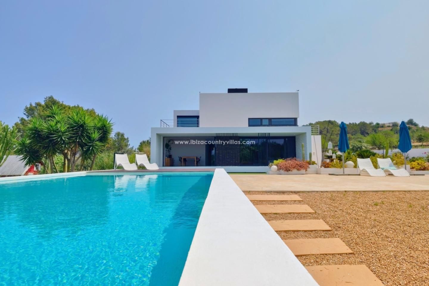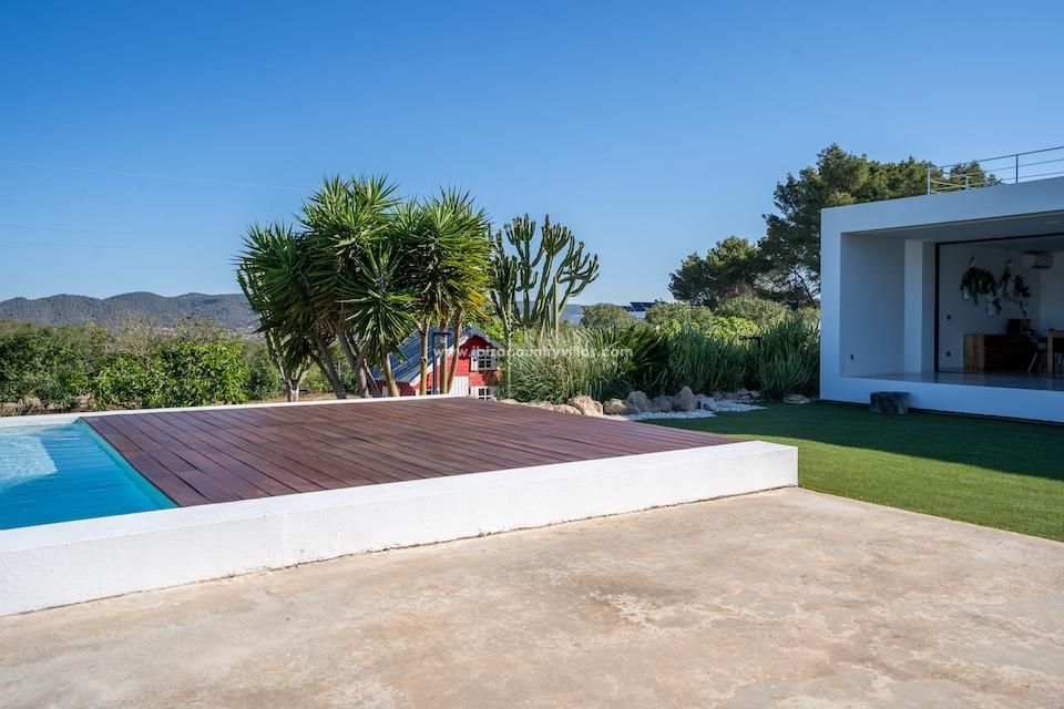 Situada en un entorno tranquilo y bien conectado, esta propiedad se alza sobre una parcela rústica de 5.390m² con acceso rápido desde la carretera principal que une Ibiza con San Antonio. Construida en 2003 y cuidadosamente mantenida, destaca por su arquitectura de líneas rectas, simetría y funcionalidad.La vivienda, con 495m² construidos, se distribuye en dos plantas y ofrece cuatro habitaciones y tres baños. En la planta principal, accesible desde la cocina o desde la entrada principal, encontramos un amplio salón con chimenea y salida directa al jardín, un comedor con vistas a la piscina y una cocina espaciosa con isla central. También dispone de lavadero, una habitación con salida a la terraza y un baño completo para invitados. Esta planta es ideal para personas con movilidad reducida.En la planta superior, la suite principal cuenta con baño privado y terraza propia. Dos habitaciones adicionales, ambas con terrazas privadas, comparten un baño completo. Además, hay una luminosa zona de trabajo con una gran mesa de madera, perfecta para despacho o estudio.El exterior ofrece terrazas cubiertas, zona chill out, piscina rectangular de 10x4,4m, comedor al aire libre con barbacoa y dos accesos independientes: uno con portón automático y aparcamiento cubierto para dos coches, y otro con espacio para varios vehículos o camiones.La casa está equipada con calefacción por suelo radiante, aire acondicionado por estancias e internet por fibra óptica. La seguridad está garantizada con sistema de alarma y puertas blindadas.Dispone de fosa séptica, pozo con abundante agua y un sótano diáfano con múltiples posibilidades.Además, cuenta con licencia turística para 8 personas.Una propiedad funcional, sólida y bien ubicada, lista para entrar a vivir.