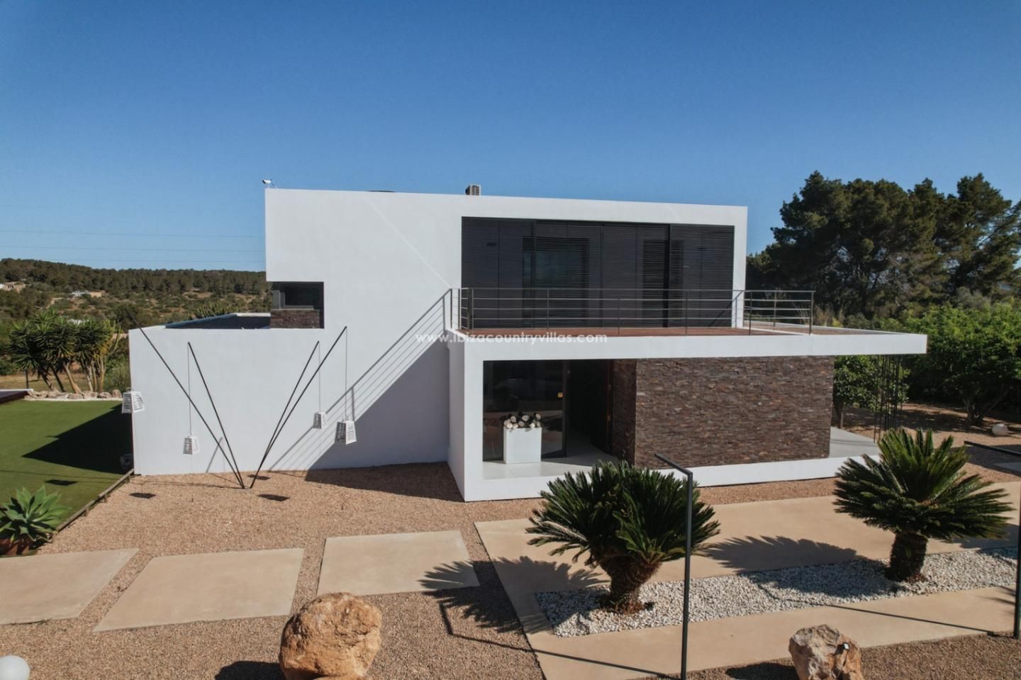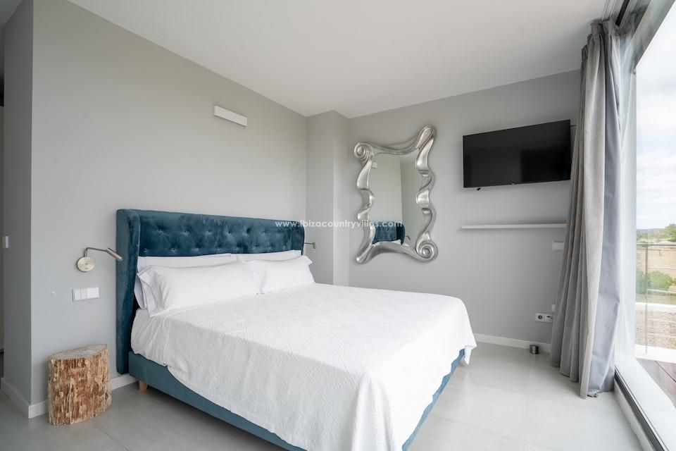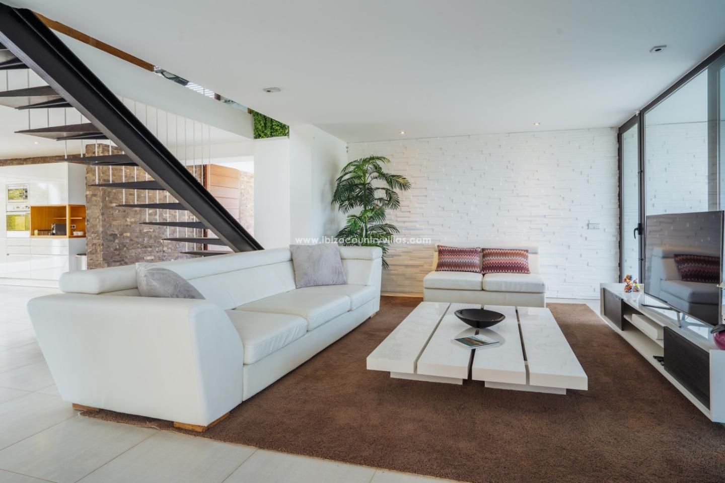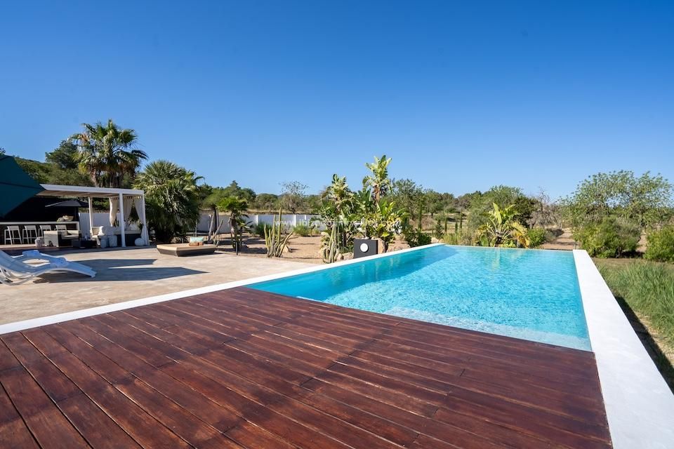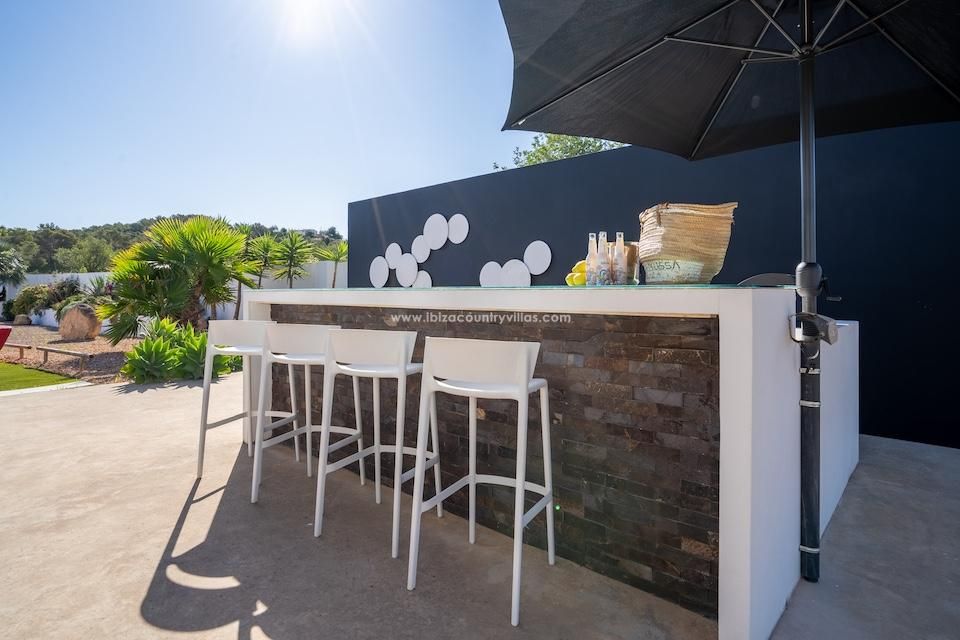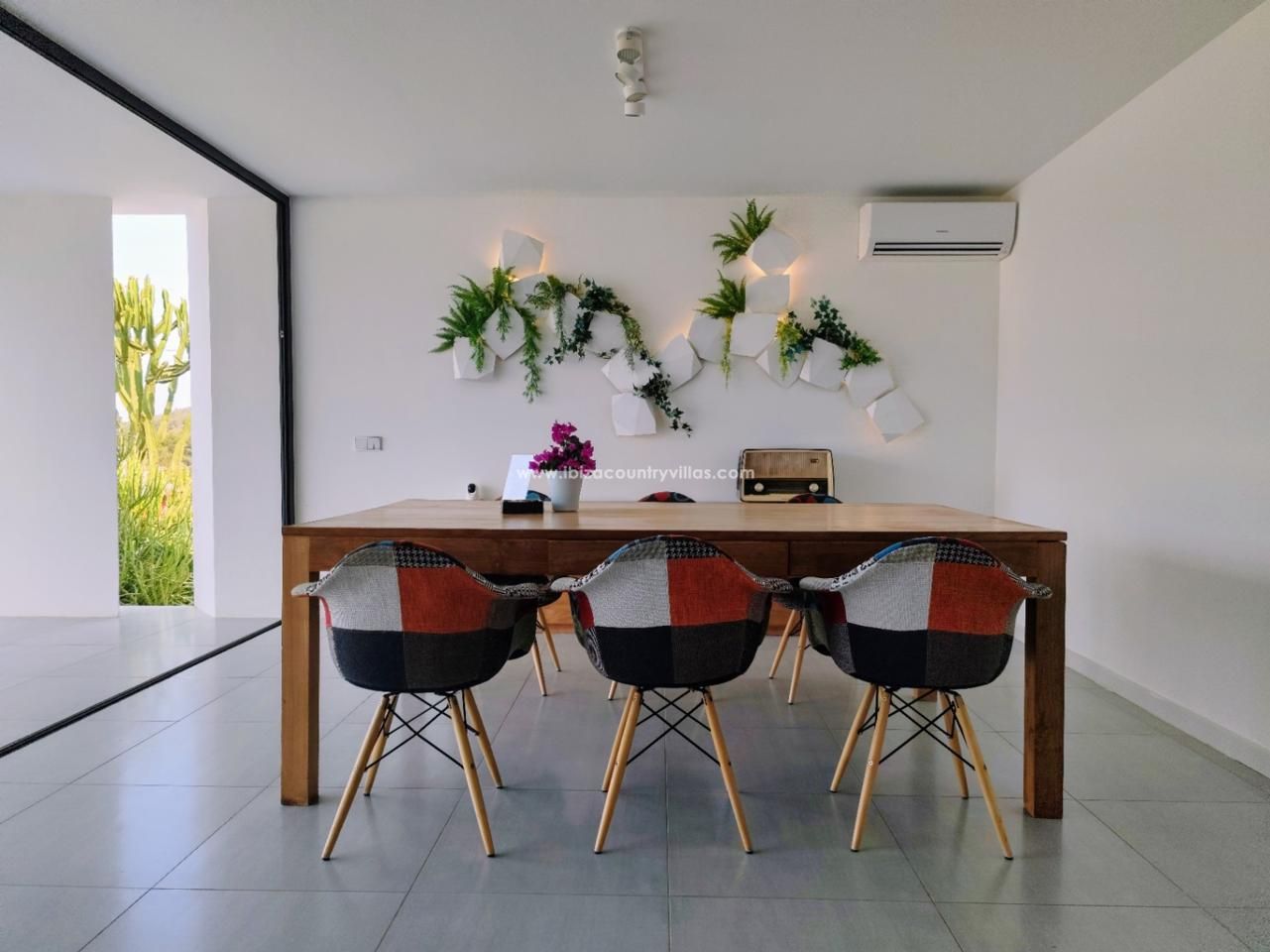 Situada en un entorno tranquilo y bien conectado, esta propiedad se alza sobre una parcela rústica de 5.390m² con acceso rápido desde la carretera principal que une Ibiza con San Antonio. Construida en 2003 y cuidadosamente mantenida, destaca por su arquitectura de líneas rectas, simetría y funcionalidad.La vivienda, con 495m² construidos, se distribuye en dos plantas y ofrece cuatro habitaciones y tres baños. En la planta principal, accesible desde la cocina o desde la entrada principal, encontramos un amplio salón con chimenea y salida directa al jardín, un comedor con vistas a la piscina y una cocina espaciosa con isla central. También dispone de lavadero, una habitación con salida a la terraza y un baño completo para invitados. Esta planta es ideal para personas con movilidad reducida.En la planta superior, la suite principal cuenta con baño privado y terraza propia. Dos habitaciones adicionales, ambas con terrazas privadas, comparten un baño completo. Además, hay una luminosa zona de trabajo con una gran mesa de madera, perfecta para despacho o estudio.El exterior ofrece terrazas cubiertas, zona chill out, piscina rectangular de 10x4,4m, comedor al aire libre con barbacoa y dos accesos independientes: uno con portón automático y aparcamiento cubierto para dos coches, y otro con espacio para varios vehículos o camiones.La casa está equipada con calefacción por suelo radiante, aire acondicionado por estancias e internet por fibra óptica. La seguridad está garantizada con sistema de alarma y puertas blindadas.Dispone de fosa séptica, pozo con abundante agua y un sótano diáfano con múltiples posibilidades.Además, cuenta con licencia turística para 8 personas.Una propiedad funcional, sólida y bien ubicada, lista para entrar a vivir.