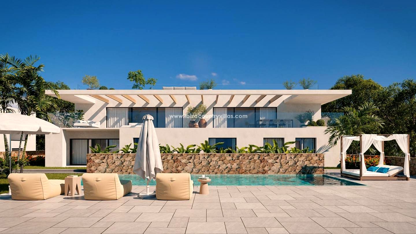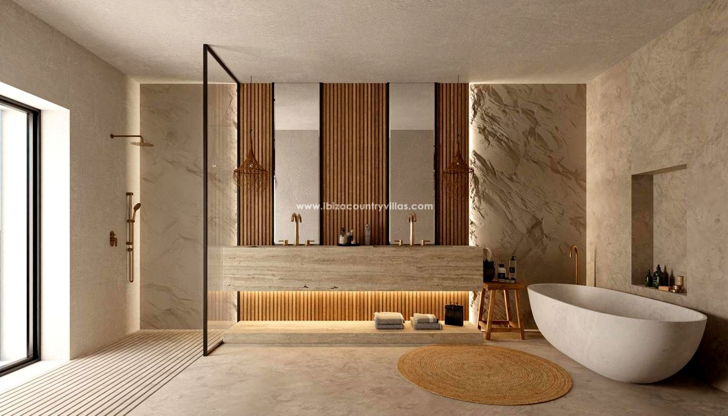 Villa in S'Estanyol, near Ibiza and Talamanca, within an exclusive collection of four properties. Its contemporary design blends modern and Mediterranean styles, featuring abundant natural light from floor-to-ceiling windows and high ceilings.