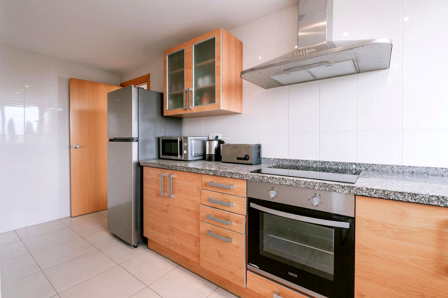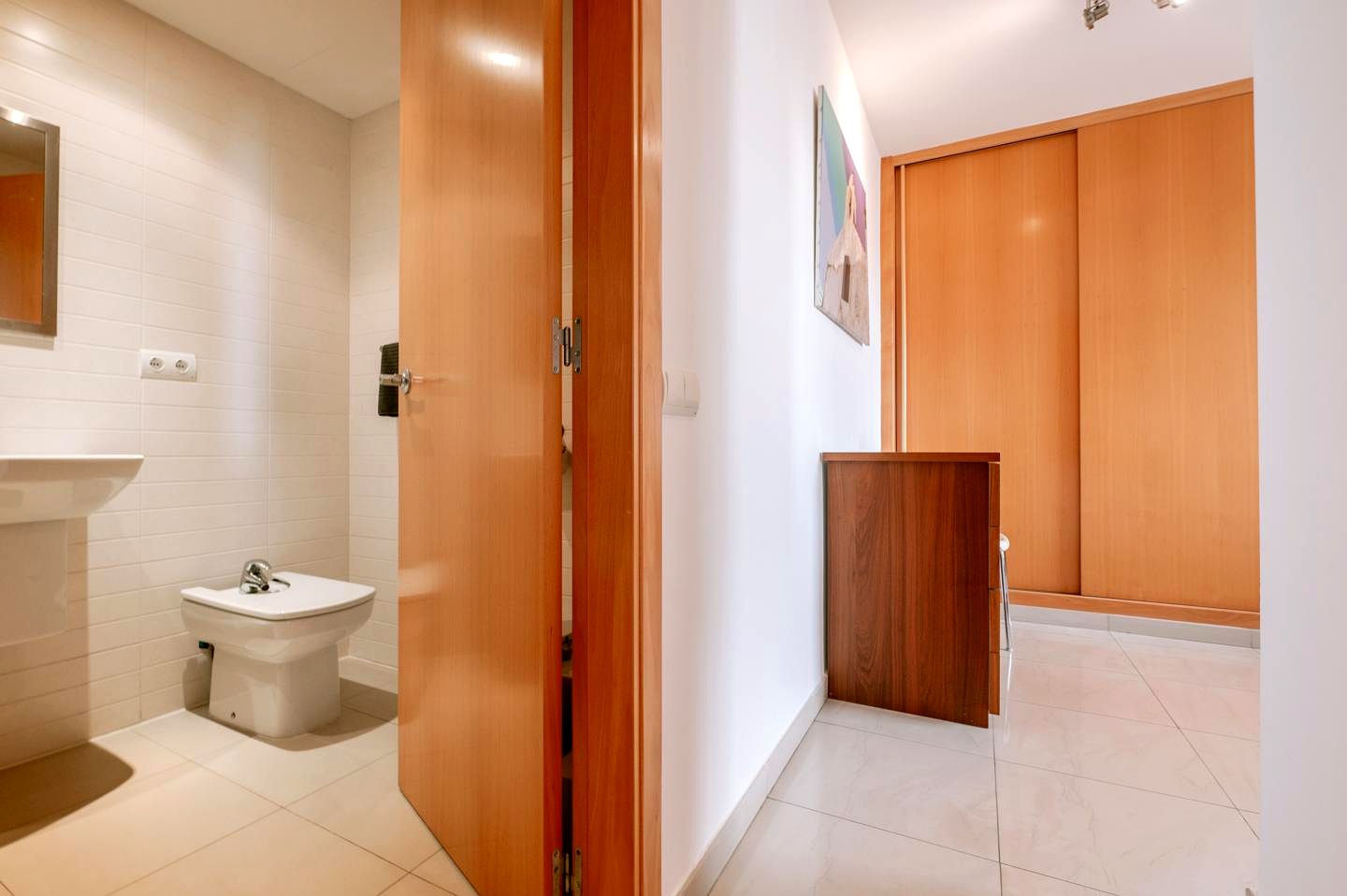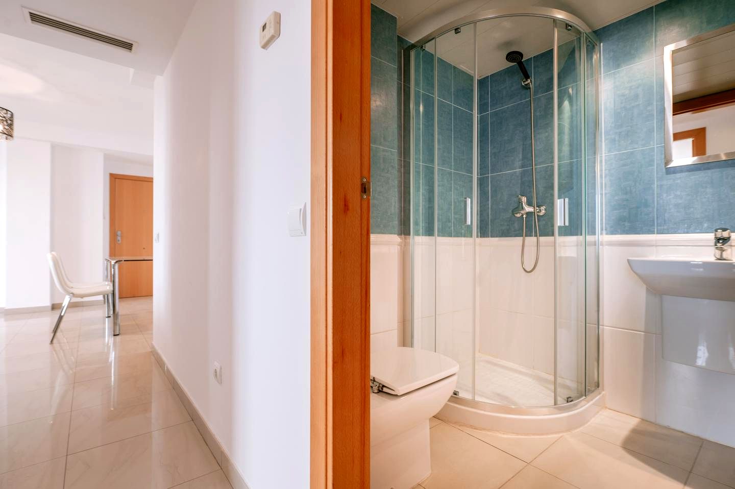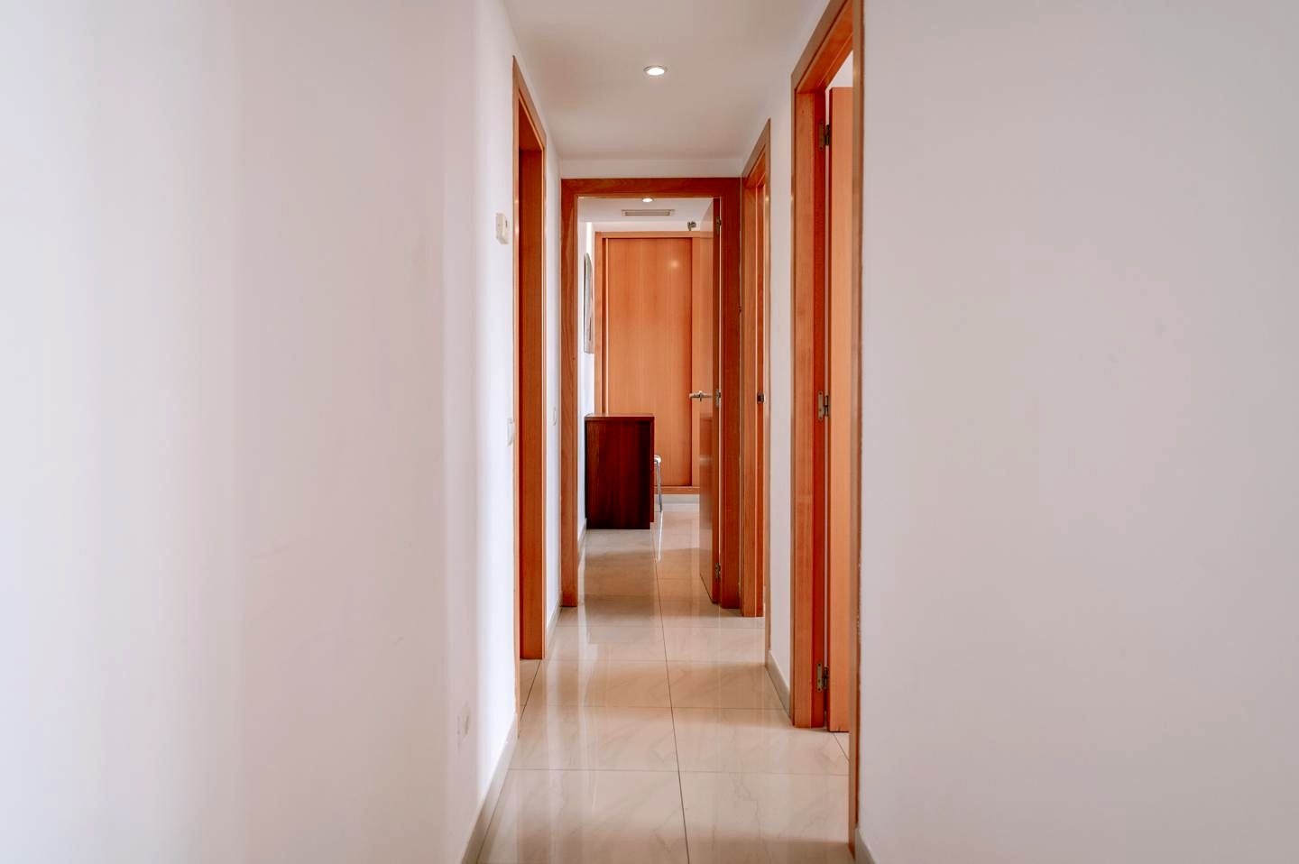 This inviting penthouse features 3 spacious bedrooms and 2 bathrooms, making it ideal for families or hosting guests. The bright and luminous living room opens onto a cozy balcony with views of the surrounding greenery, offering an intimate space to relax and drink your morning coffee. The bedrooms are thoughtfully designed, each with built-in closets providing ample storage space. Large windows in every bedroom allow natural light to flood the interiors, enhancing the sense of space and tranquility. The apartment is decorated with a neutral, minimalist aesthetic, while warm wooden doors and details create a soothing, homely atmosphere. The functional layout ensures comfort and practicality throughout the property. Furthermore, the separate kitchen is fully equipped, offering a distinct area for culinary endeavors, and its location away from the living room enhances privacy and tidiness. Adjacent to the kitchen, a practical laundry room adds convenience to the home. The property is a blank canvas, inviting you to furnish or renovate it according to your personal style, making it a space where your vision of home can truly come to life.