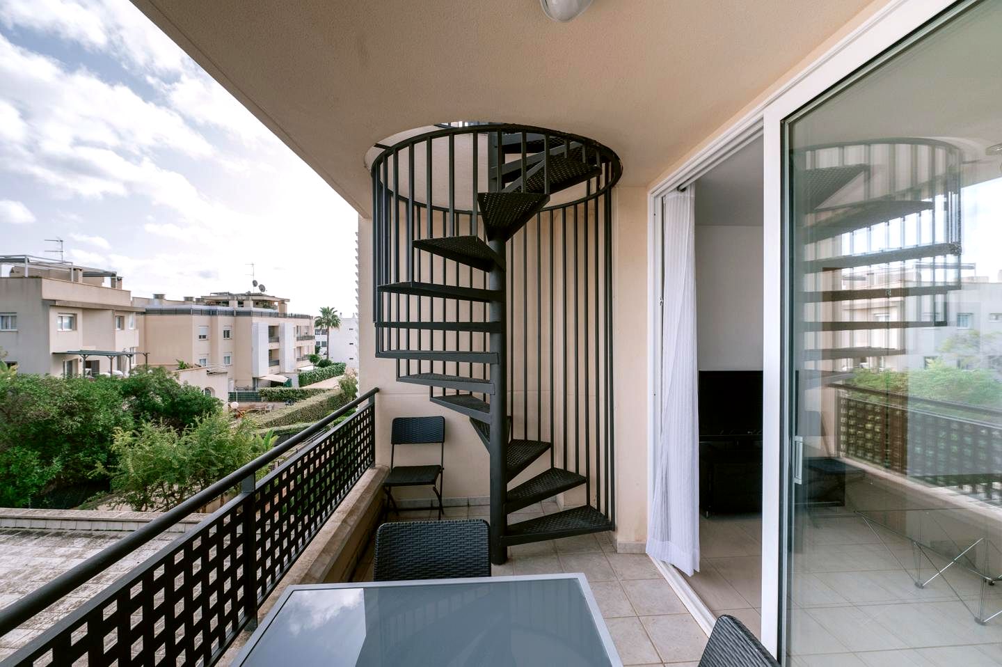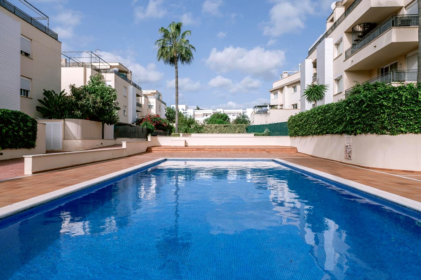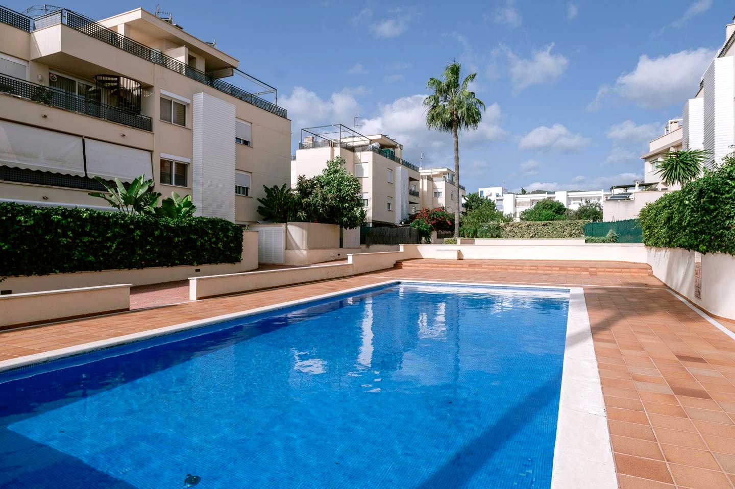 The outdoor spaces of this penthouse are truly exceptional. The expansive private rooftop terrace is the highlight, offering breathtaking panoramic views of Ibiza Town, the iconic Dalt Vila, and the surrounding hills. Whether it’s for outdoor dining, sunbathing, or enjoying quiet moments of reflection, this spectacular terrace elevates everyday living. The rooftop also features a large solar panel, reflecting the eco-conscious design of the property. Also, the communal areas of the complex enhance the Spanish living experience. The communal pool is surrounded by large palm trees and beautifully landscaped gardens, offering a serene retreat to cool off during warm summer days or to unwind with a good book. The lush greenery of the gardens creates a calming atmosphere, ideal for peaceful walks. Additionally, the property includes a secure private parking space in the underground garage, ensuring convenience and safety. Life in this Ibiza penthouse is as effortless as it is luxurious.