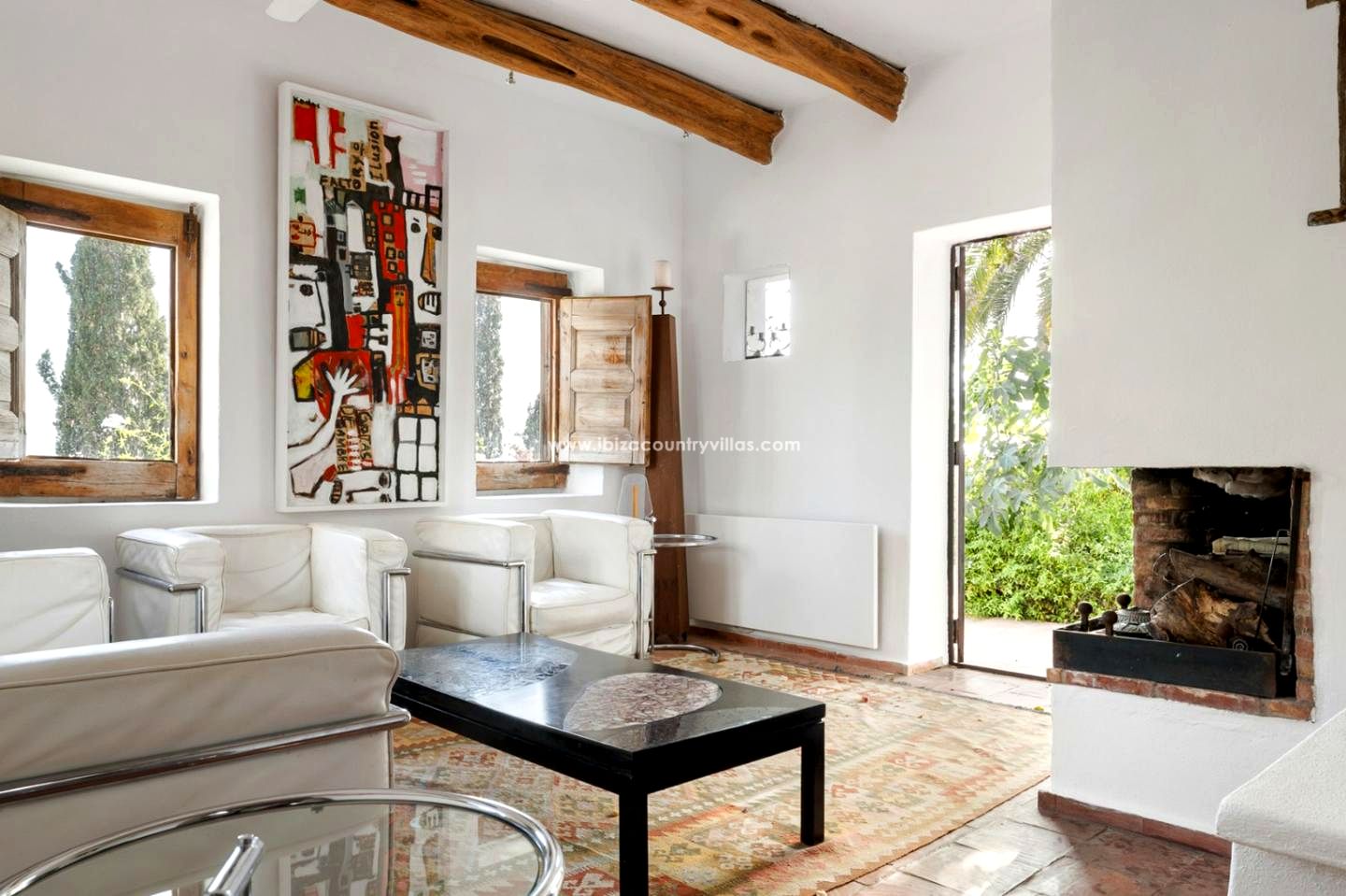 The interior is organized around a spacious traditional Ibizan living room, the heart of the house from which the different areas are articulated. The property features three en-suite bedrooms, in addition to an extra bedroom with an independent bathroom on the upper floor. The kitchen and dining area are located next to the entrance hall, while the living room with a fireplace connects directly to the garden and pool. Large windows flood each space with natural light and open views to the green surroundings that encircle the property.