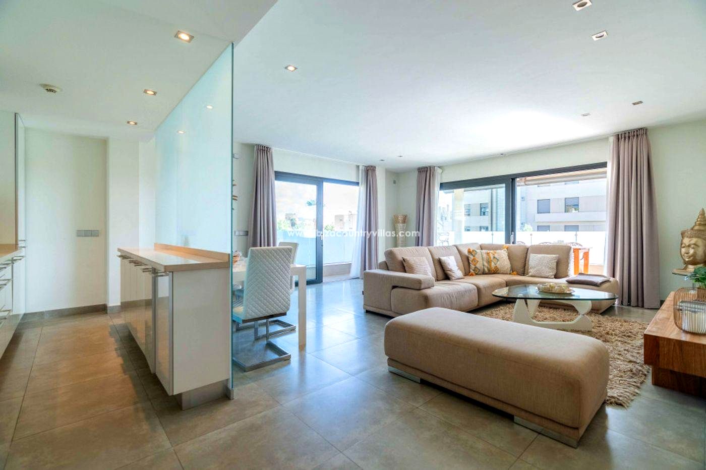 The property has 116 m² built, a bright open-plan living-dining room with 2.6 m ceilings, a fully equipped modern kitchen, and direct access to a large perimeter terrace, ideal for outdoor enjoyment. It features two double bedrooms, one with an en-suite bathroom, as well as a second bathroom and an independent laundry room.