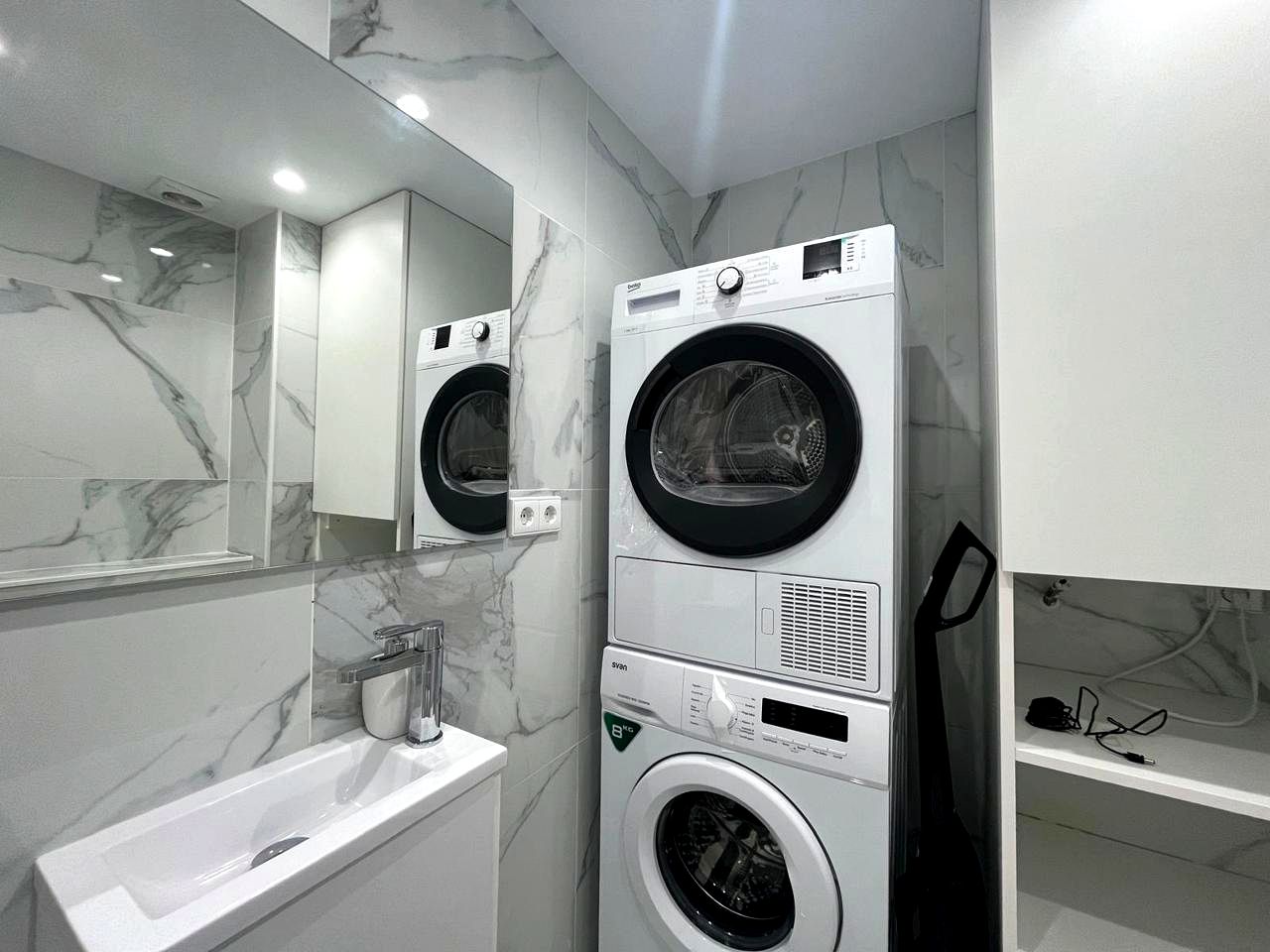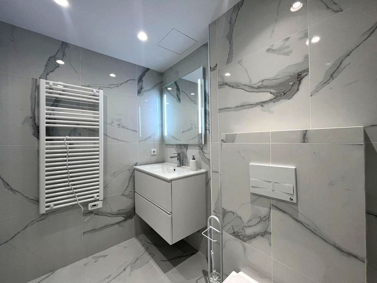 The interior features a bright living room, decorated with high-quality materials and large windows. The fully equipped kitchen blends seamlessly with the dining area and the living room. The apartment also has a guest toilet upon entry and includes a bedroom with a built-in wardrobe and an en-suite bathroom.
