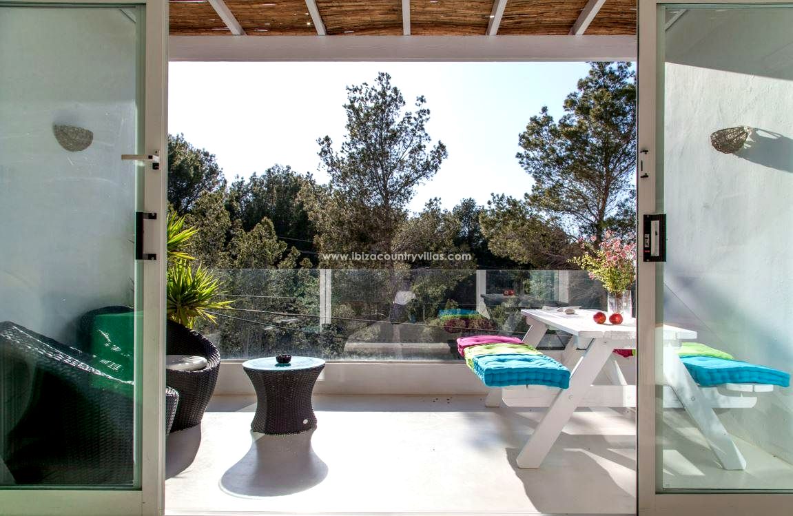 Desde la terraza principal se disfrutan de bonitas vistas al mar, a la playa y a las espectaculares puestas de sol de Ibiza.