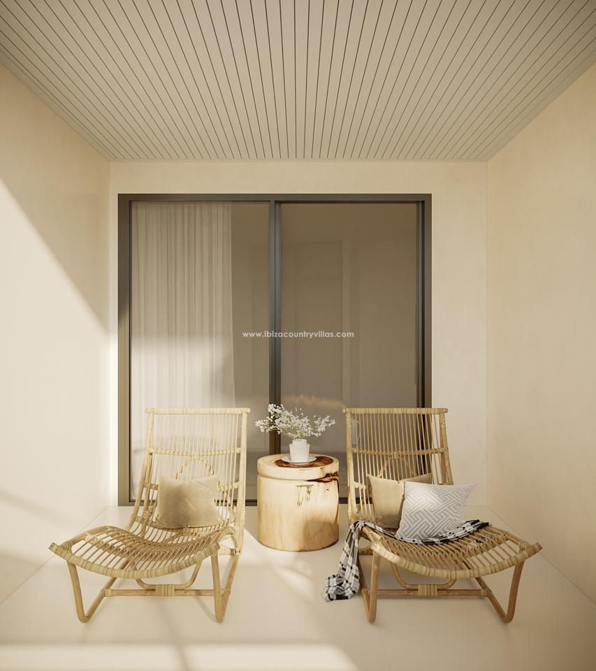 Las grandes puertas correderas de cristal se abren a una terraza privada con vistas a Dalt Vila, un rincón ideal para desconectar del ritmo urbano. Con una cuidada zona de estar exterior y detalles de vegetación, la terraza ofrece el equilibrio perfecto entre la energía de Marina Botafoch y la serenidad de un espacio privado.