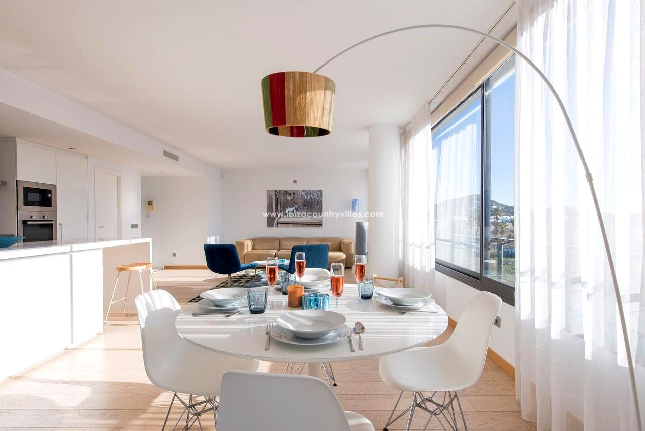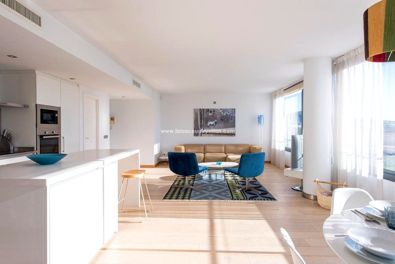 Diseñado para ofrecer el máximo confort y un estilo de vida sin complicaciones, el apartamento cuenta con una luminosa y espaciosa zona de estar con una cocina abierta en el centro. Los grandes ventanales y las puertas correderas inundan el espacio de luz natural y dan directamente al balcón privado, el lugar perfecto para disfrutar de las vistas y del ambiente de Ibiza.
