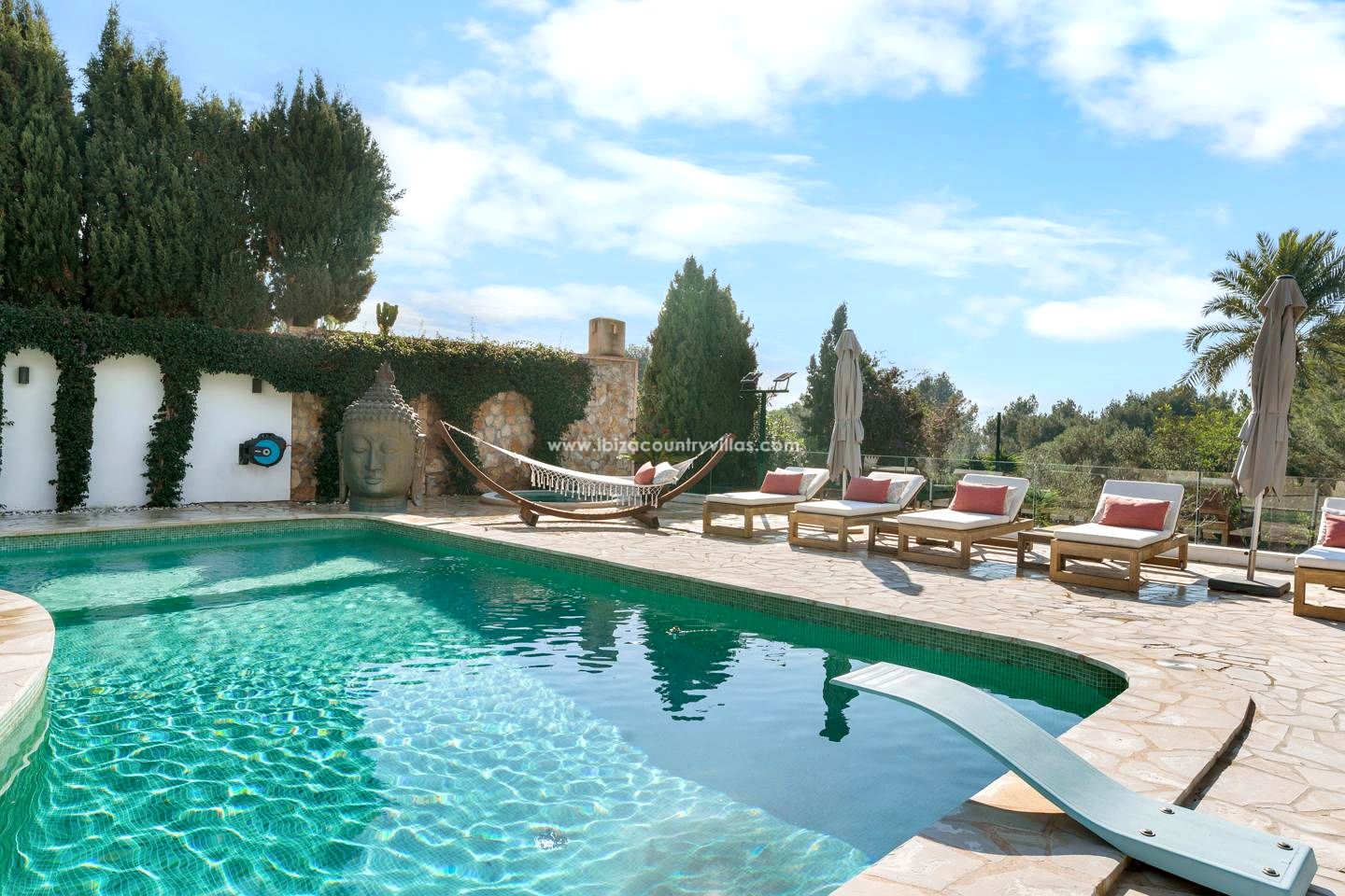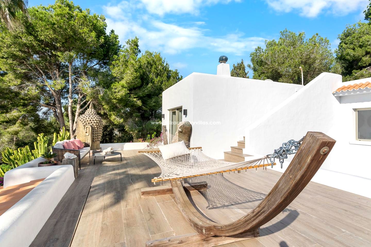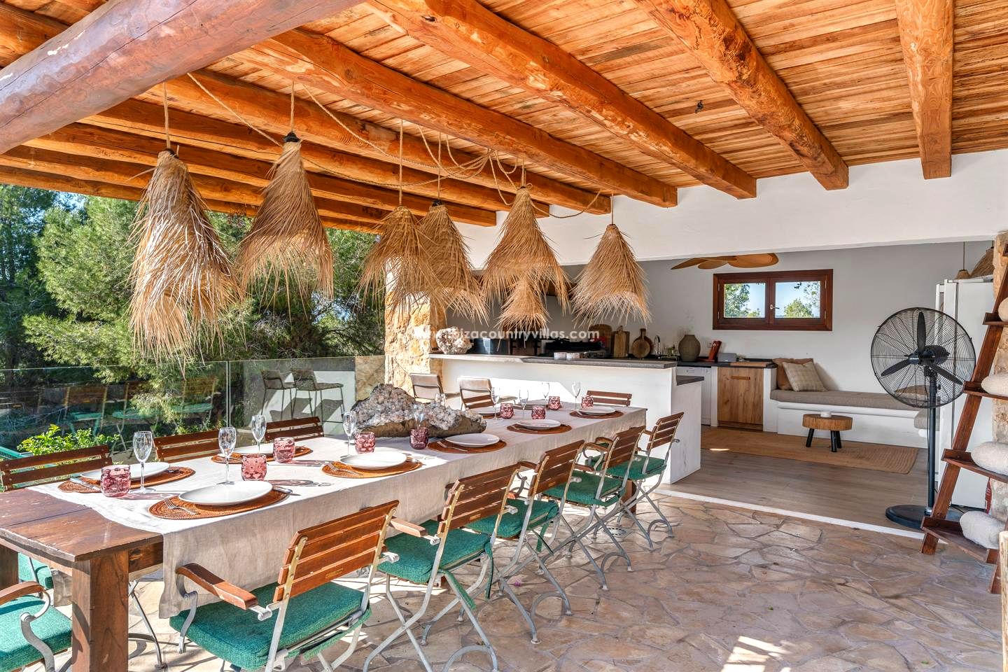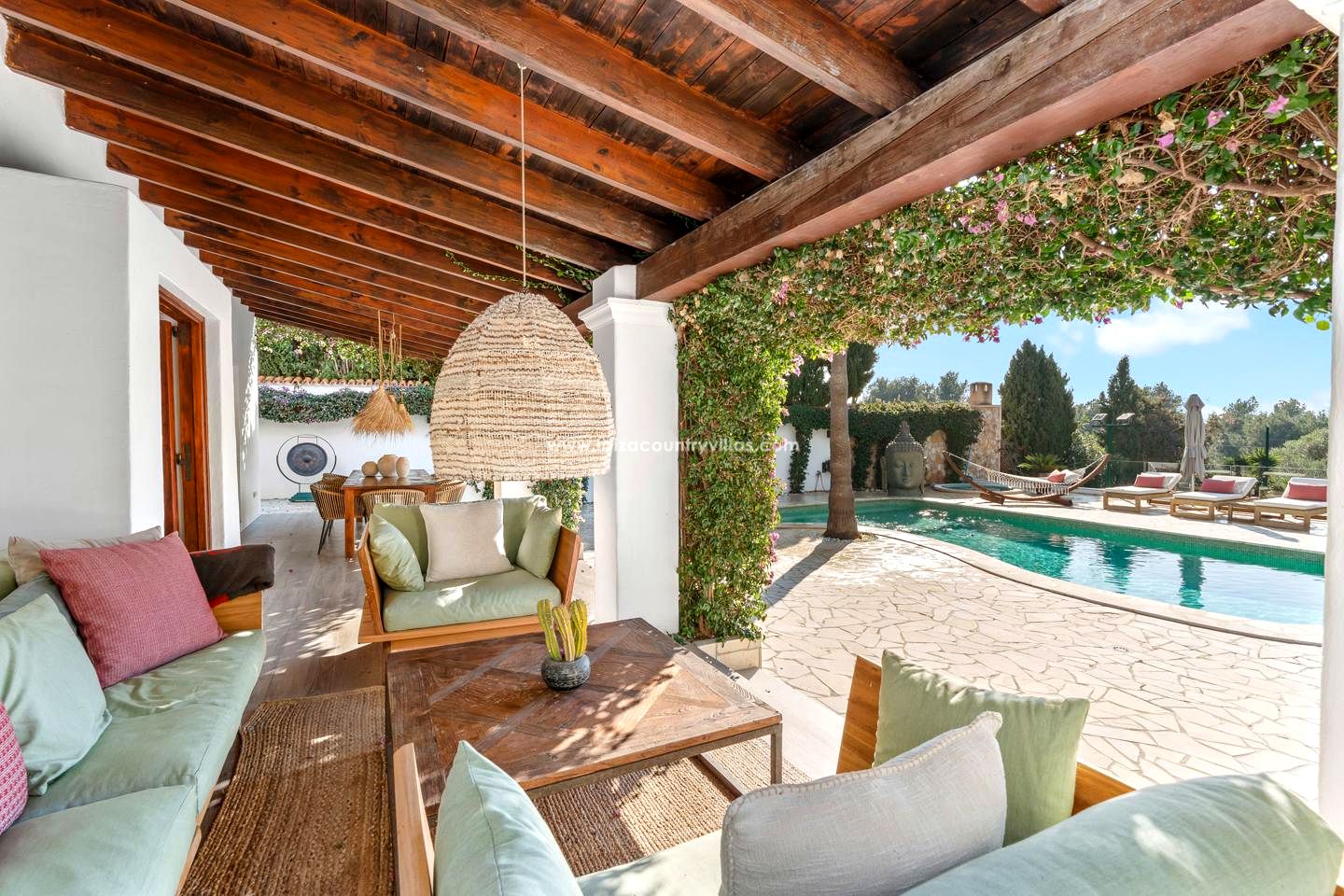 Es fácil imaginar la vida en esta elegante finca rodeada de naturaleza, a solo unos minutos del encantador pueblo de Jesús y a corta distancia de Ibiza ciudad. Situada al final de una tranquila calle sin salida y con el bosque como telón de fondo, la propiedad transmite una sensación inmediata de calma y privacidad absoluta. Aquí, el silencio se mezcla con el sonido suave del viento entre los árboles, y cada rincón invita a desconectar del mundo exterior.
