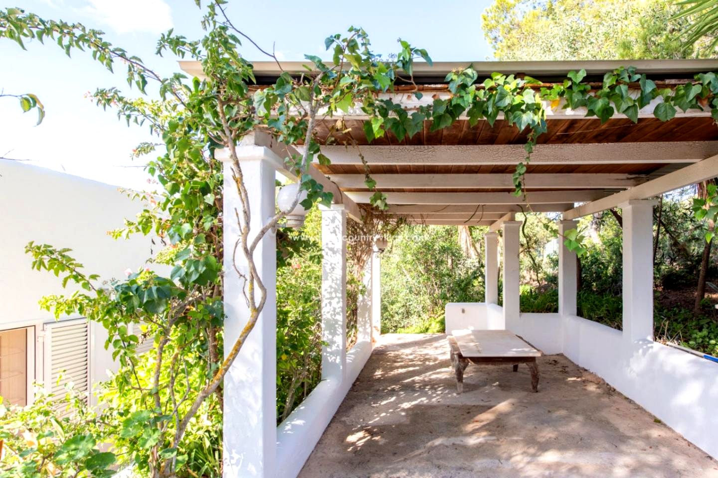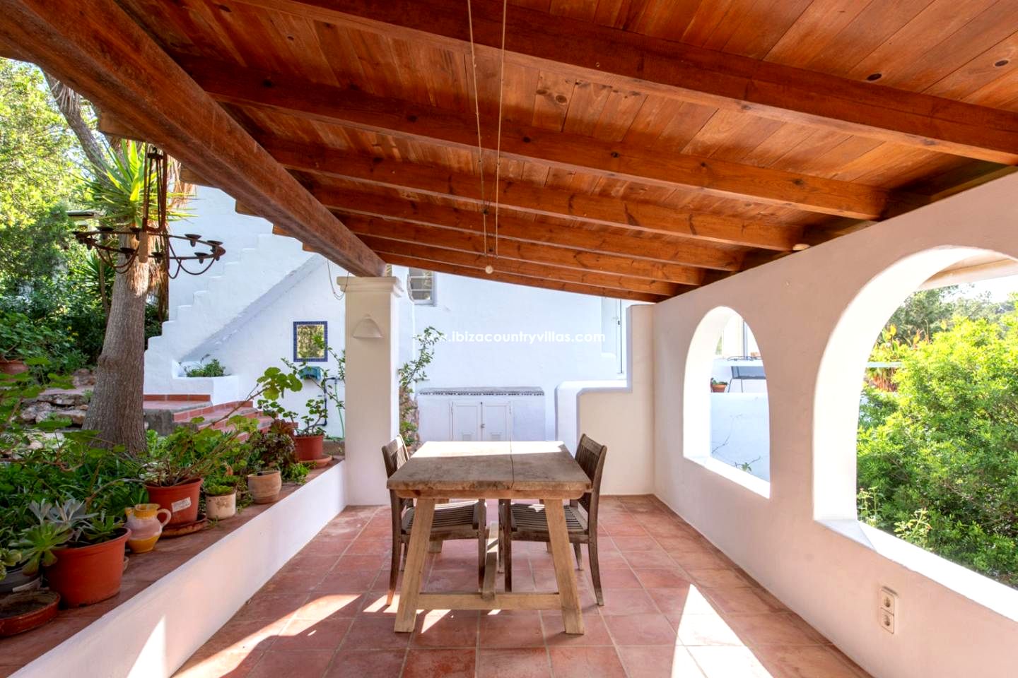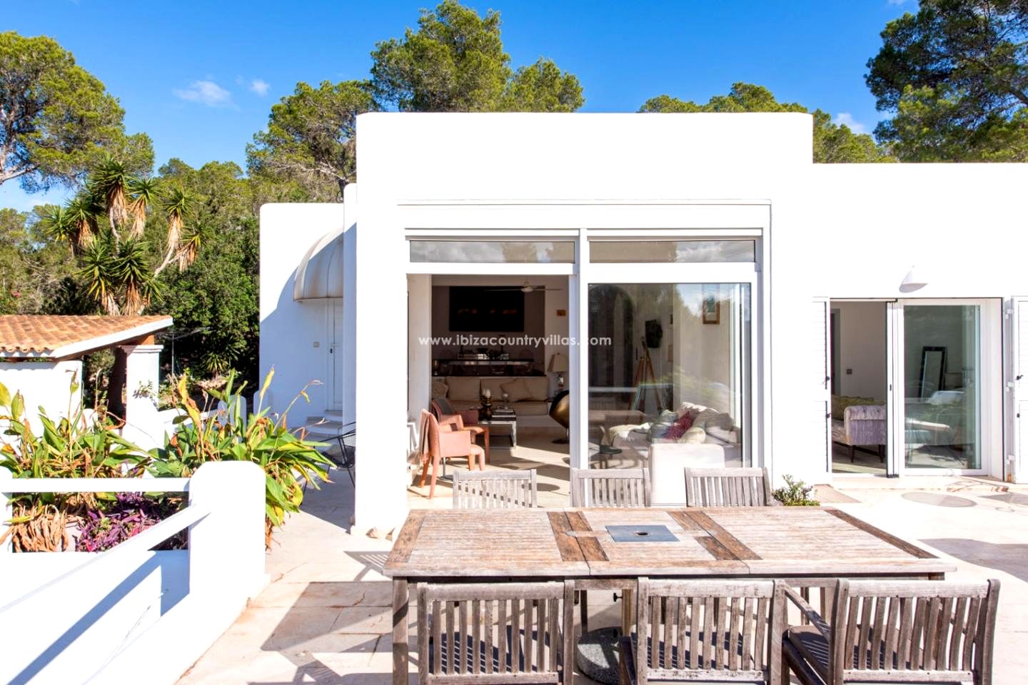 Los exteriores incluyen una piscina rodeada de vegetación autóctona y varias terrazas con sombra, ideales para comer, descansar o disfrutar del clima ibicenco. La villa también dispone de plaza de parking cubierta, un valor añadido en esta zona natural tan preservada.