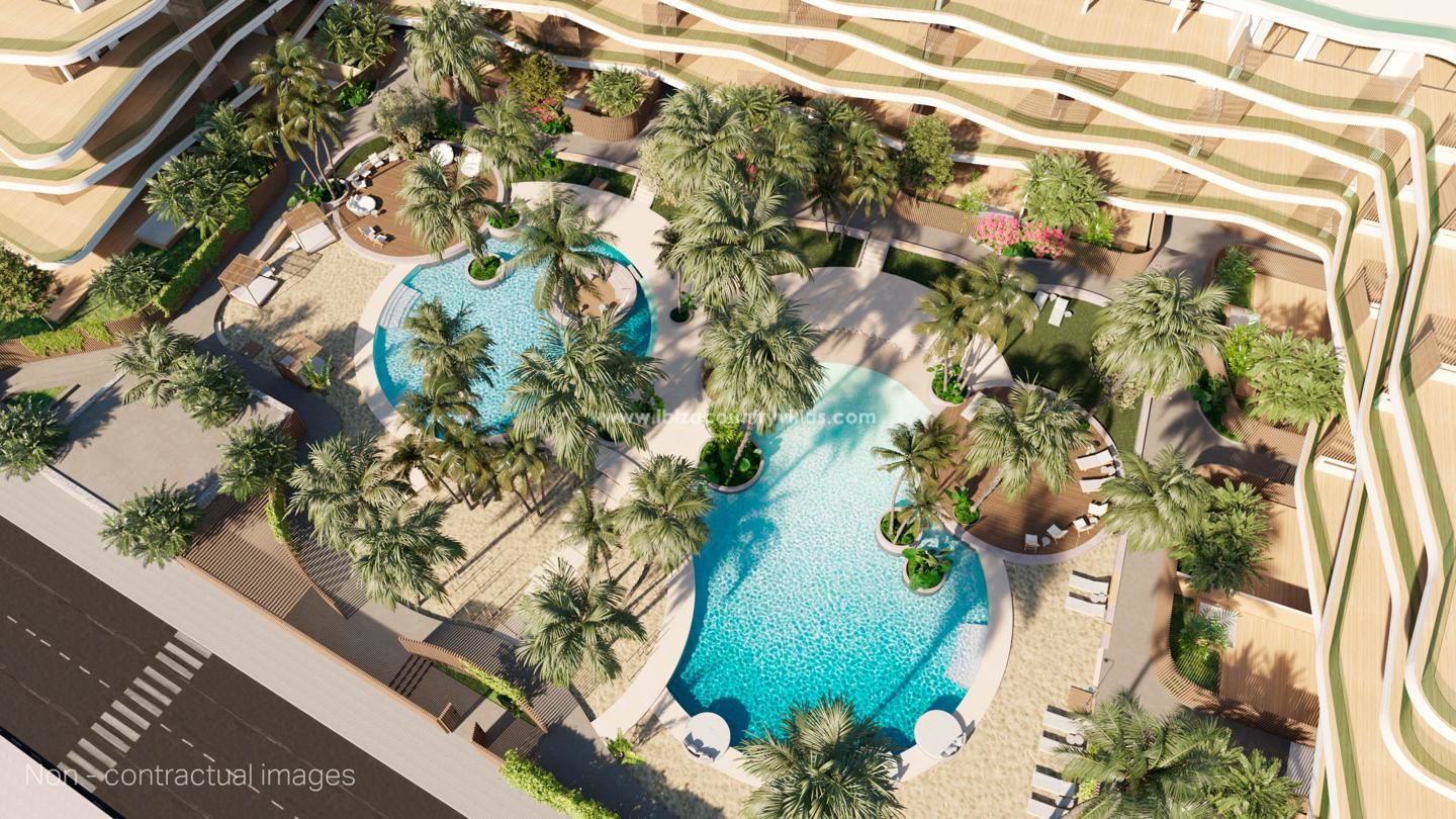 Cuenta con gimnasio, parkings, trasteros, zonas ajardinadas, áreas lounge y piscinas.