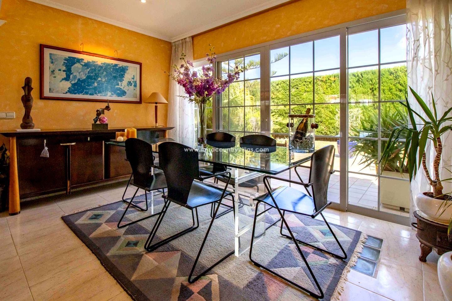 En el exterior destacan los jardines maduros y perfectamente cuidados, las amplias terrazas y porches, la zona BBQ y una gran piscina privada, ideales para el estilo de vida mediterráneo. Desde la villa se disfrutan de impresionantes vistas panorámicas a Dalt Vila y su castillo, un valor añadido que refuerza su carácter exclusivo.