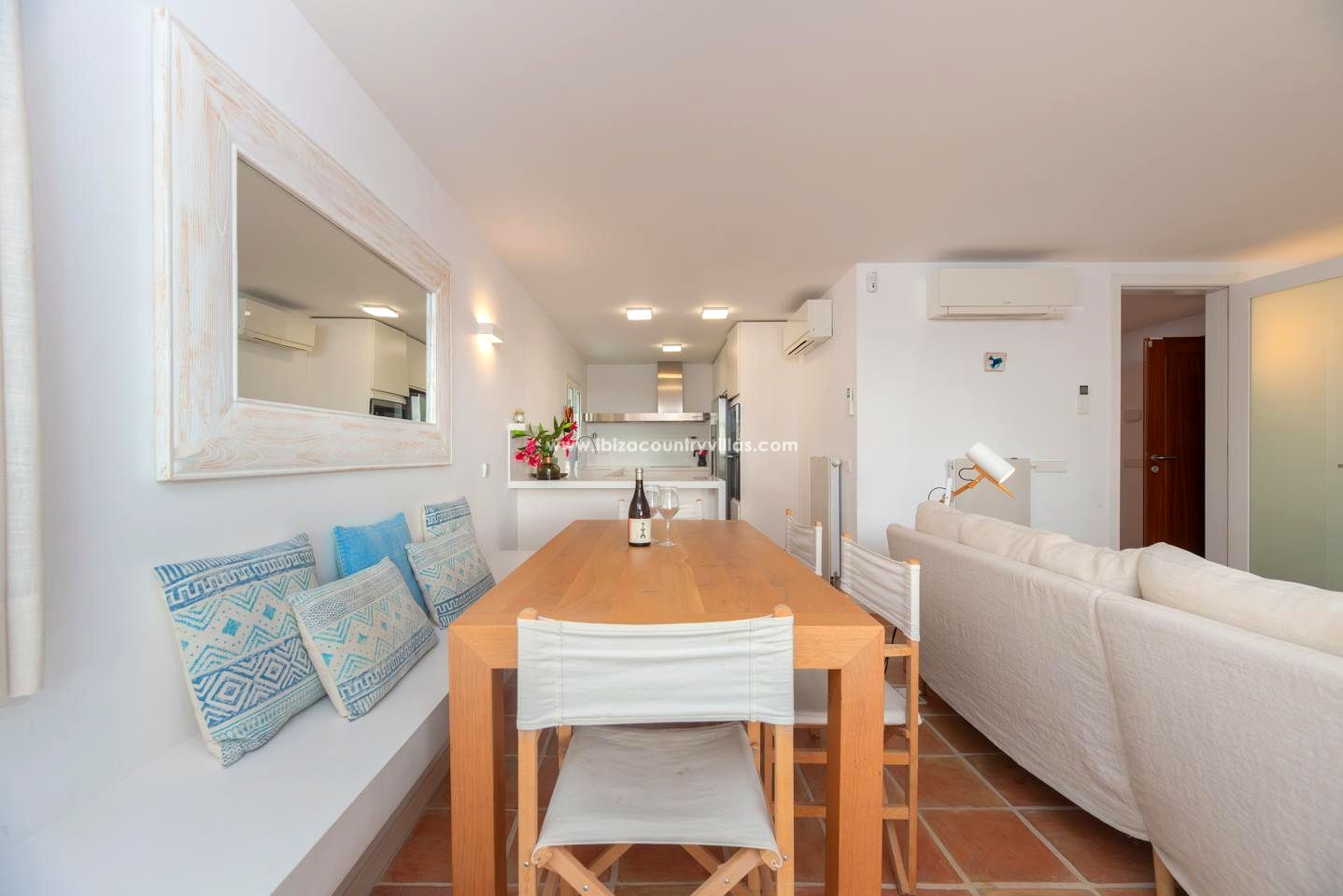 Desde la villa se pueden contemplar bonitas vistas al mar y al icónico perfil de Dalt Vila, ofreciendo un paisaje único tanto de día como al atardecer.